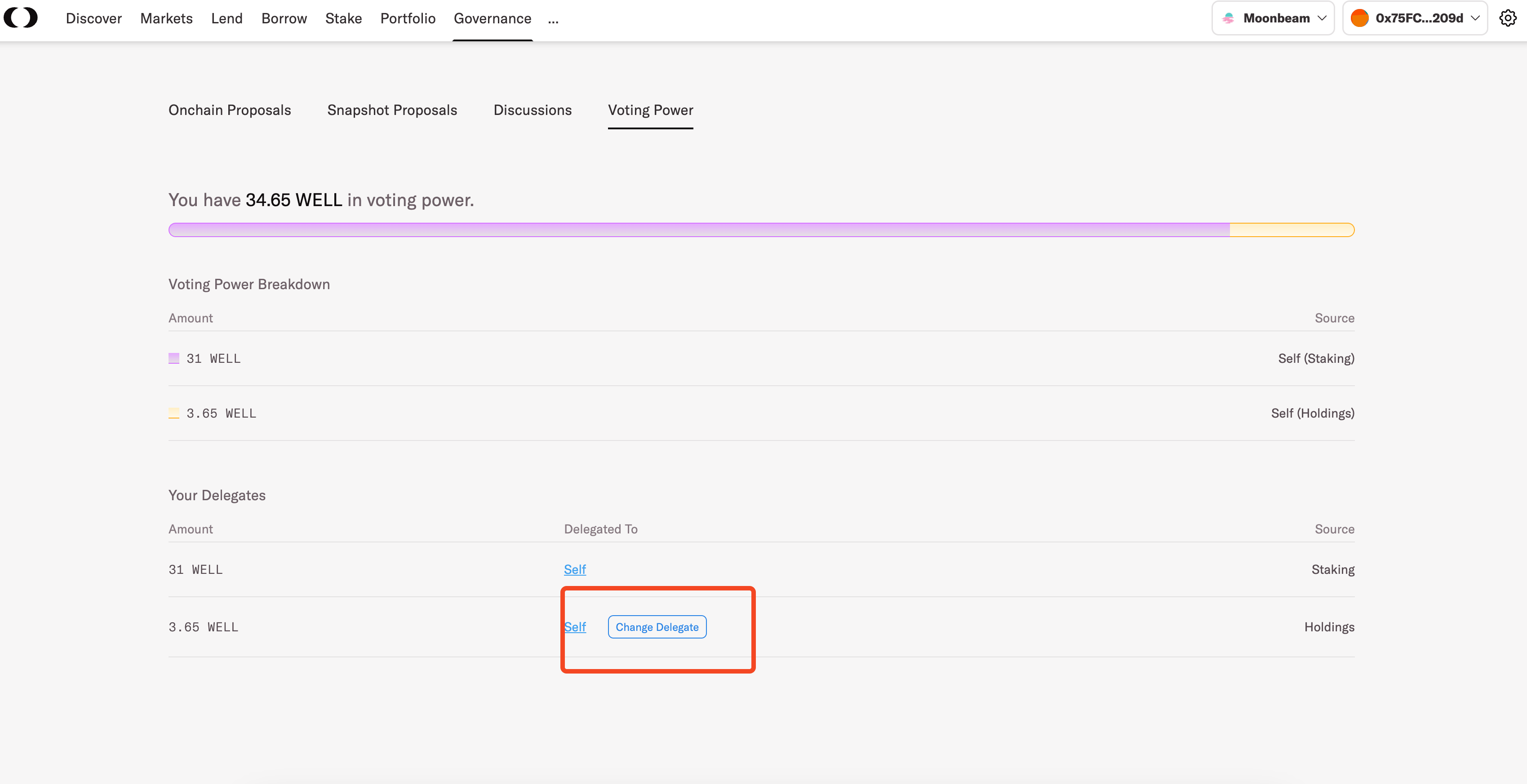 To start the delegation process, WELL and MFAM token holders are required to access "[**Governance**](https://moonwell.fi/governance/voting-power)", then choose the "**Voting Power**" subcategory. In this section, holders can access a comprehensive breakdown of their voting power. The total voting power shown is the sum of the following:
