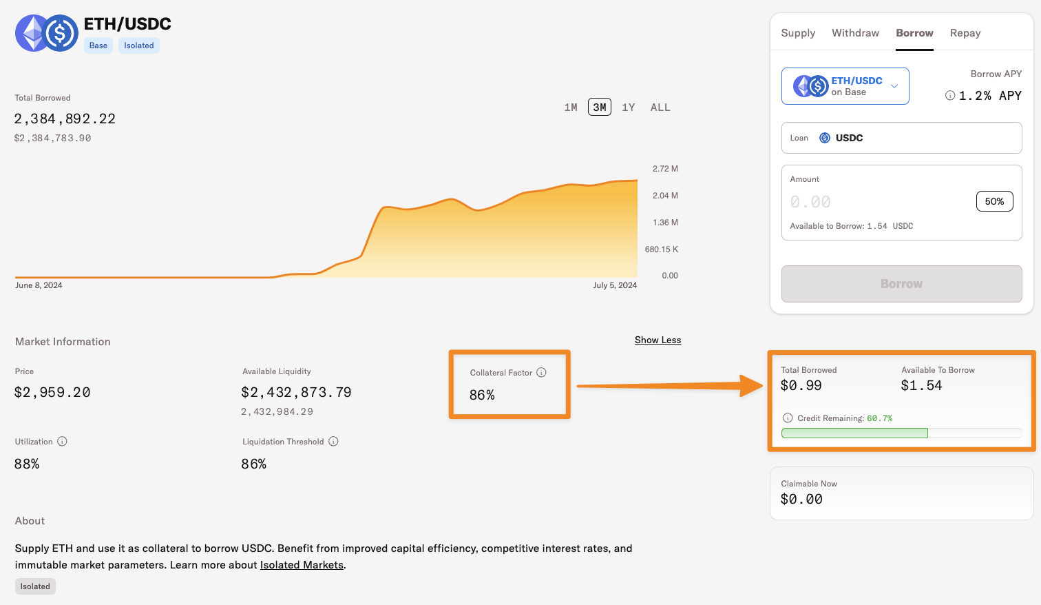 <figure><img src="https://38185780-files.gitbook.io/~/files/v0/b/gitbook-x-prod.appspot.com/o/spaces%2F4535Mbmb8O8Y5q8Xz3cK%2Fuploads%2F0n9dvhlsf6mDM4ySGUcH%2FCleanShot%202024-07-06%20at%2000.56.19.png?alt=media&#x26;token=9fd1136c-352a-4beb-9859-71eba0ecf83b" alt=""><figcaption><p>Collateral Factor and Credit Remaining is visible on every Isolated Market page. </p></figcaption></figure>