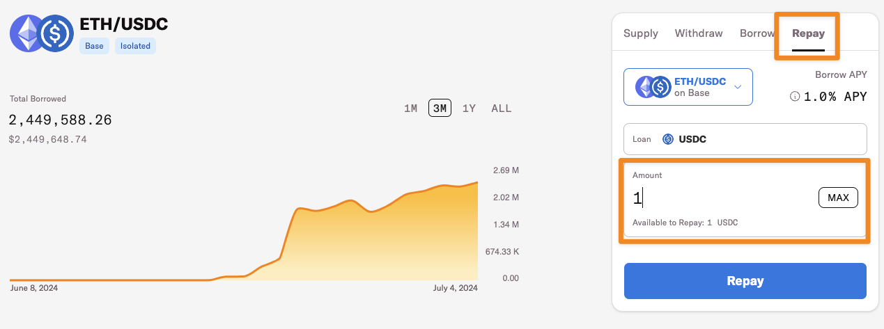<figure><img src="https://38185780-files.gitbook.io/~/files/v0/b/gitbook-x-prod.appspot.com/o/spaces%2F4535Mbmb8O8Y5q8Xz3cK%2Fuploads%2F8AdQaRAnJdUZifNNLIfL%2FCleanShot%202024-07-05%20at%2003.17.31.png?alt=media&#x26;token=2b3b7d40-8e61-4a65-8176-97a2cc067008" alt=""><figcaption><p>Your Portfolio will present you with the option to repay the borrowed asset under "Open Positions." You will be taken to that market's page to perform the repayment.</p></figcaption></figure>