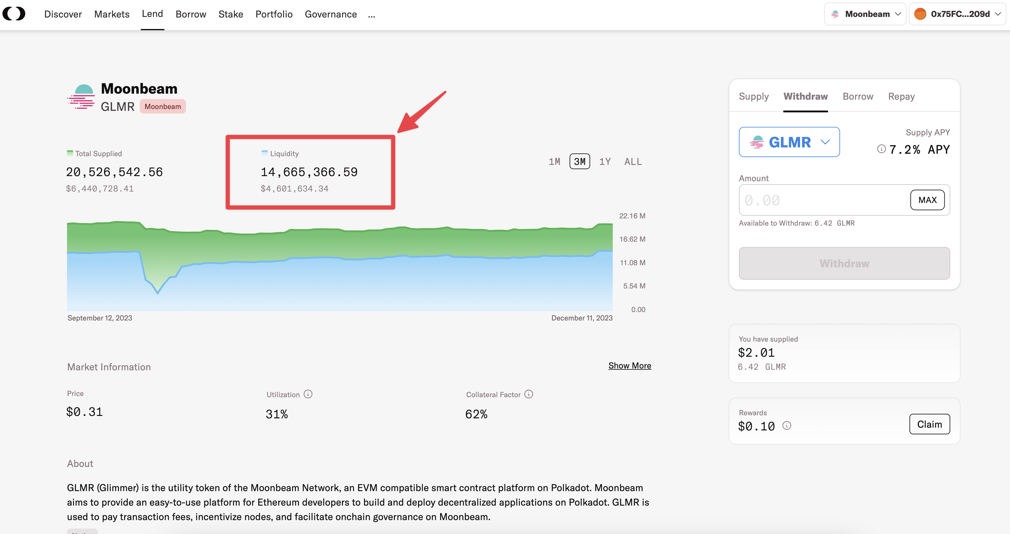 To avoid such failures, users should compare the withdrawal amount with the liquidity available in the market they intend to withdraw from. To check the liquidity of a specific market, go to either "[**Lend**](https://moonwell.fi/markets/supply/moonbeam/glmr)" or "[**Borrow**](https://moonwell.fi/markets/borrow/moonbeam/glmr)", select the desired asset, and refer to the market information (as shown in the screenshot below).