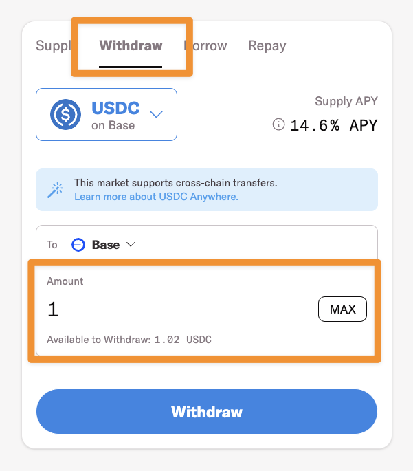 5. Confirm the transaction in your wallet and wait for it to execute. Once successful, the asset will be withdrawn from Moonwell and sent to your onchain wallet.