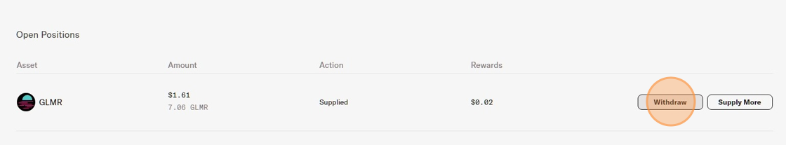 2. Locate the "**Open Positions**" section and click on "**Withdraw**" for the desired asset.