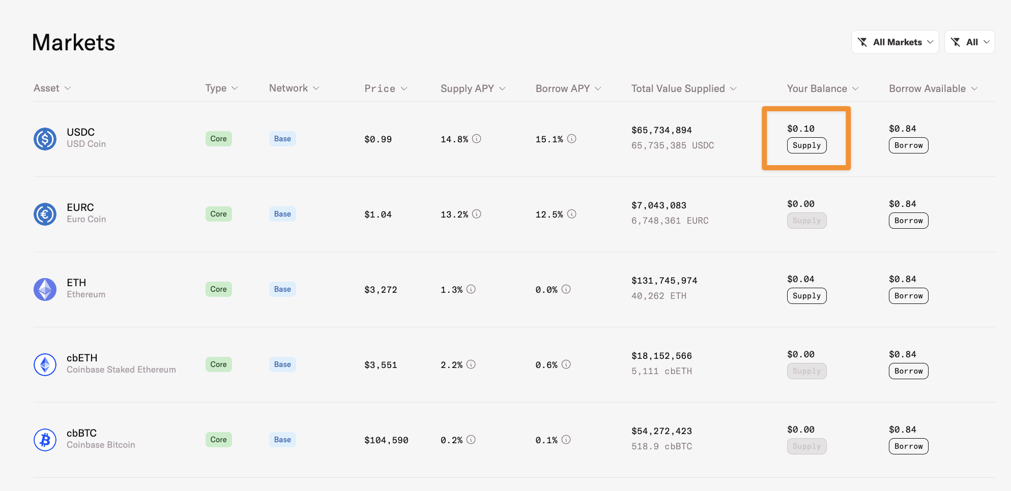 2. Click "**Supply**" on the asset you would like to withdraw